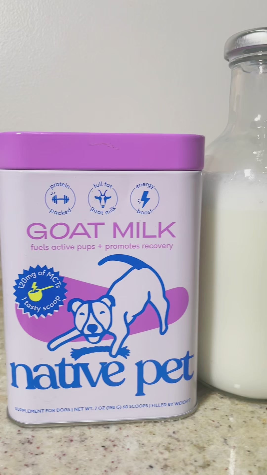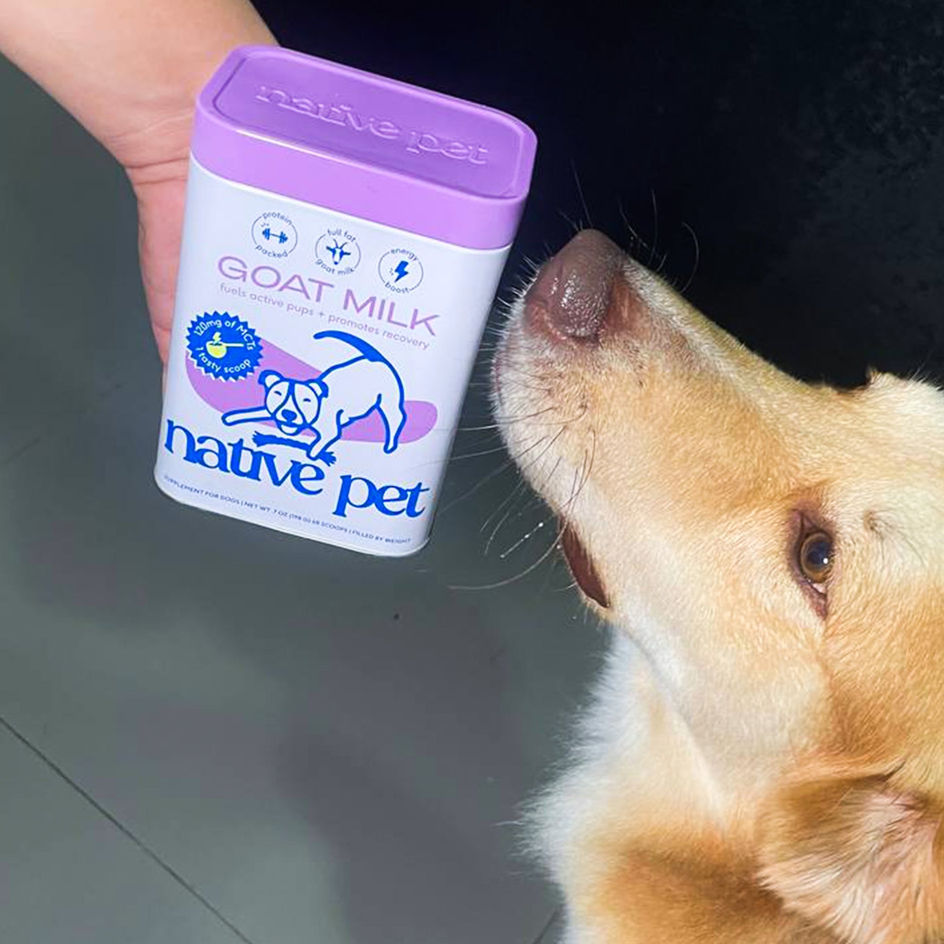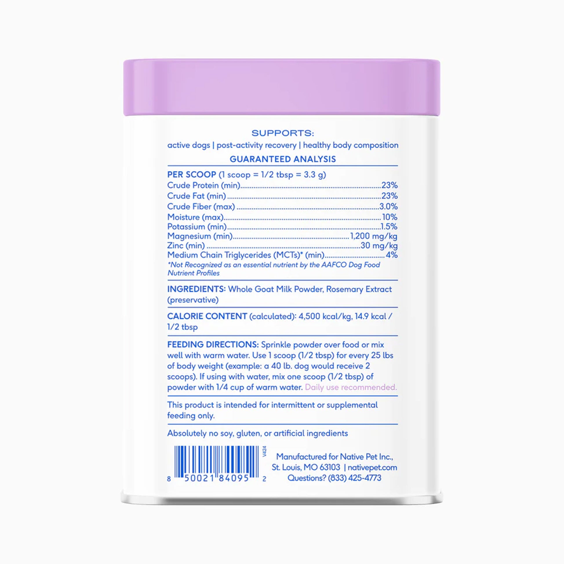 Leche de cabra orgánica en polvo de Native Pet, elaborada con ingredientes naturales y leche 100 % pura, sin aditivos ni conservantes artificiales. Ideal para todas las razas y etapas de vida.