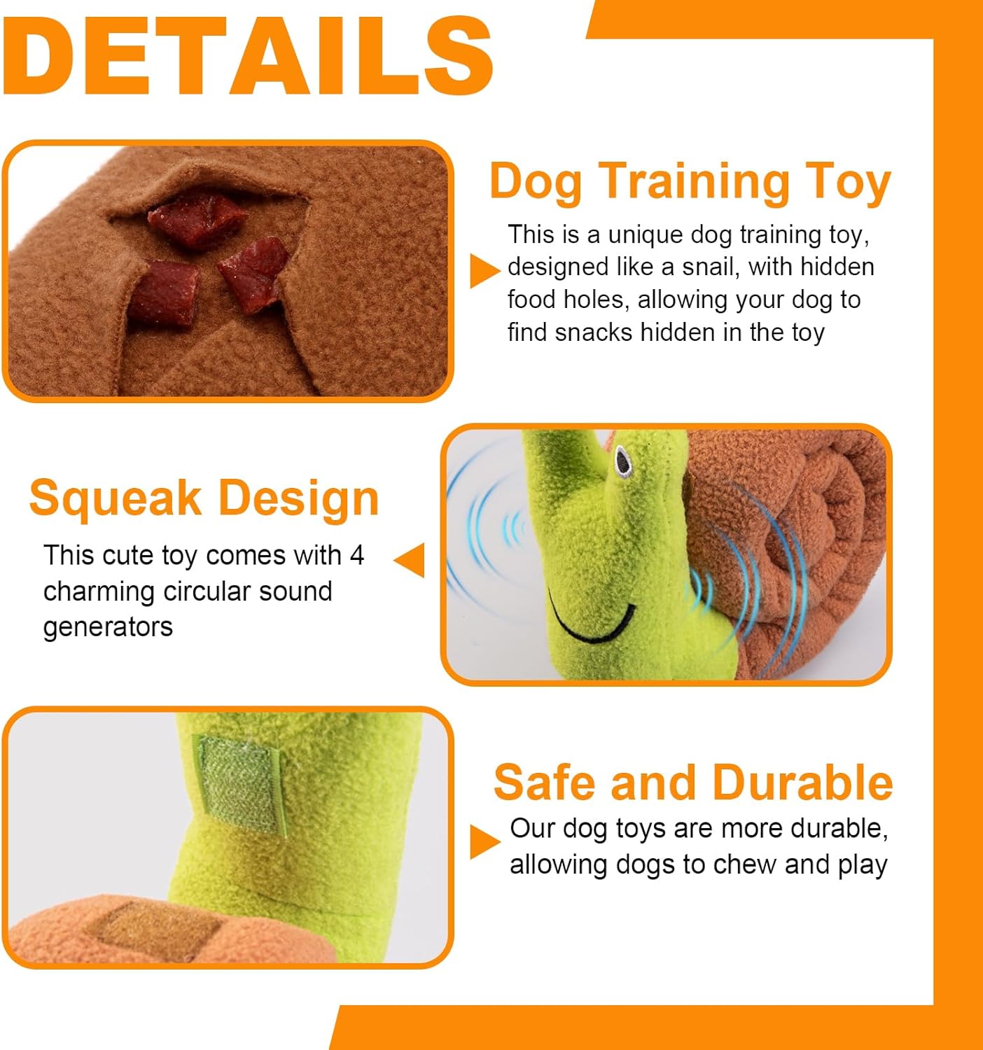 - Diseño interactivo y divertido: su forma de caracol incluye un chirriante integrado y una textura suave que invita a morder, apretar y jugar, fomentando la curiosidad y el instinto de búsqueda de tu mascota.