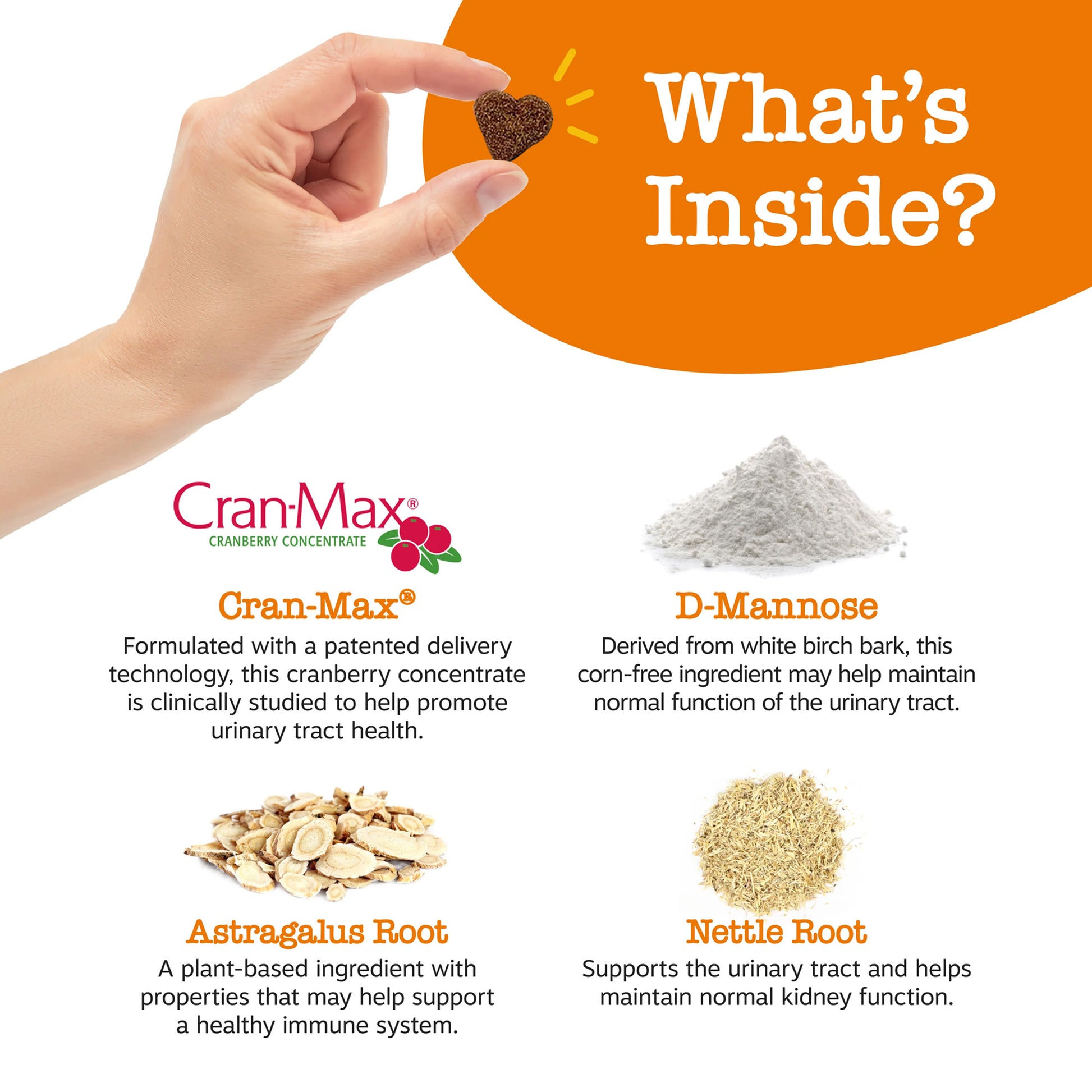 - Con InCRANable: cada masticable contiene este concentrado de arándano de primera calidad, que es un antioxidante utilizado para promover la función del tracto urinario y mantener la salud normal de la vejiga.